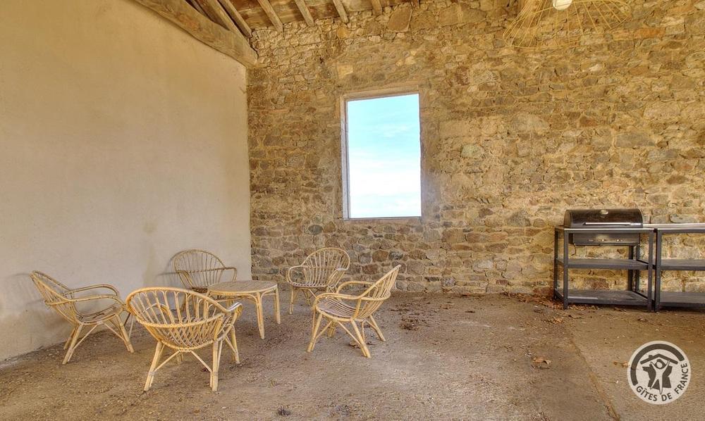 Grand Gîte "Le Vigneron" - 15 personnes - Château des Tours à St Etienne-La-Varenne dans le Beaujolais - Rhône : coin détente sous la terrasse couverte.