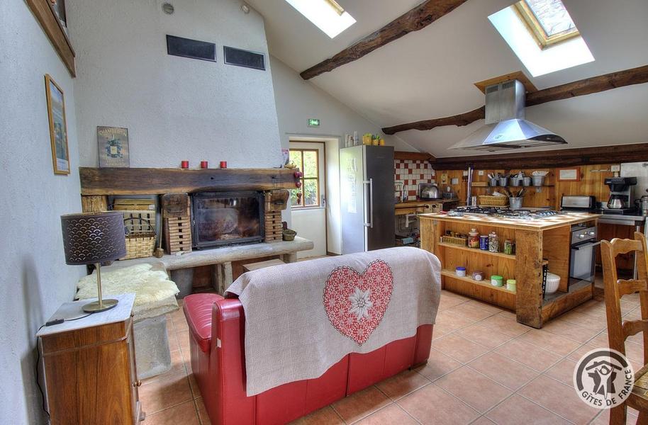 Grand gîte - 32 personnes "L'Étape Cavalière" à Beaujeu - dans le Beaujolais - Rhône : le salon avec cheminée et coin cuisine.