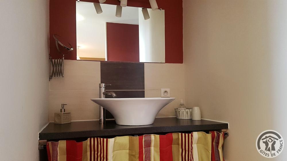 Chambres d'hôtes "Domaine Gilles Coperet" à Regnié-Durette dans le Beaujolais - Rhône : Chambre "Les Glycines", lavabo ouvert sur la chambre.