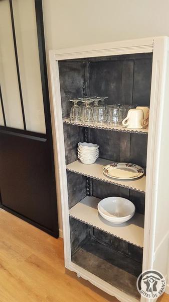 Chambres d'hôtes "Domaine Gilles Coperet" à Regnié-Durette dans le Beaujolais - Rhône : Vaisselle à disposition dans le séjour de la Suite "Esprit d'Antan".