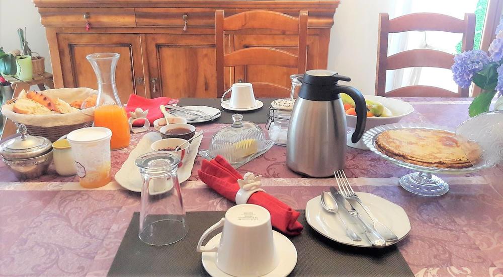 Chambres d'hôtes "Domaine Gilles Coperet" à Regnié-Durette dans le Beaujolais - Rhône : petit déjeuner avec confitures maison, miel du pays, viennoiseries de la boulangerie, crêpes maison...