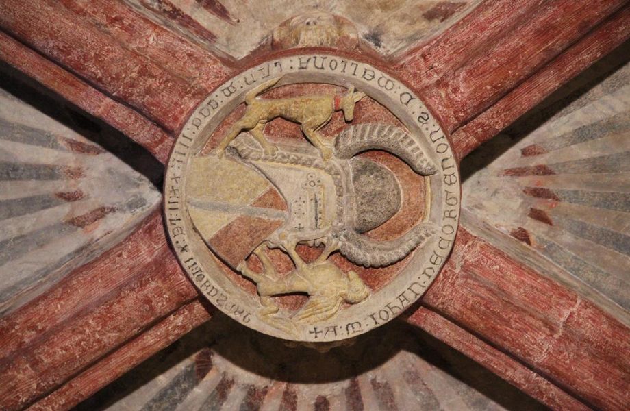 A gauche de l’entrée (au nord) on accède à la chapelle des Corgenon, du nom de son fondateur, placée sous le vocable de Notre-Dame et de St Jean Baptiste. Sa date de construction, 1382, est certifiée par la clé de voûte qui montre le blason des Corgenon où l’on peut lire l’inscription en langue vulgaire : « A.M. JOHANN DE CORGENON MCCC III XX II, LE XII JOR DE SP ». La chapelle sud (à droite de l’entrée), fut fondée par la seconde femme de Jean de Corgenon, Jeanne de St Trivier. Les peintures murales : Ces fresques présentent un caractère exceptionnel pour le département de l’Ain. Datées de la fin du XIVème- début XVème, leur style, la finesse des visages, les nuances de couleur et de nombreuses autres caractéristiques les rapprochent d’un style italien florentin ou siennois dans la lignée de Giotto.