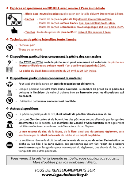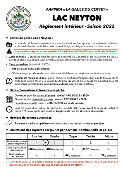 Carte à l'année : 75 € Carte à la journée (à partir du 19/03/22) : - 8 € dans les points de vente : Bar de la place Dagneux, Gamm vert Dagneux, Décathlon Beynost Pour pêcher sur les différents parcours, la carte « La Gaule du Cottey » est obligatoire. Renseignements auprès de la Gaule du Cottey ou su le site internet pour les tarifs.