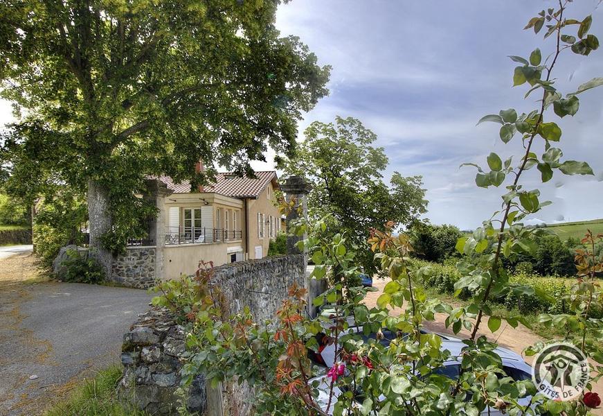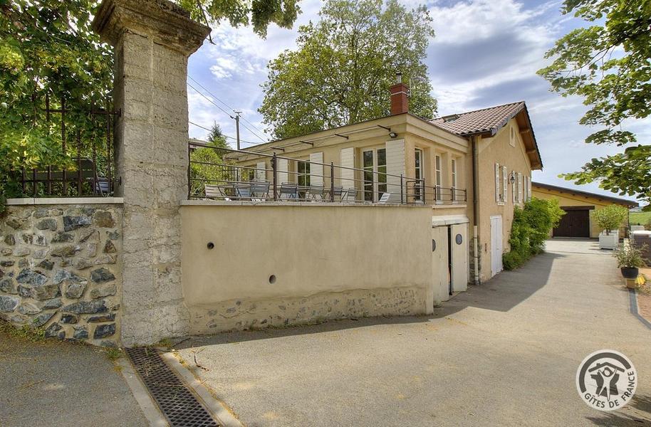 Sur un domaine viticole en Beaujolais, grand gîte de caractère avec 5 chambres, joliment restauré. Grand confort, équipements de qualité, décoration mêlant l'ancien au moderne (sol en terre cuite dans le séjour, charpente bois apparente).