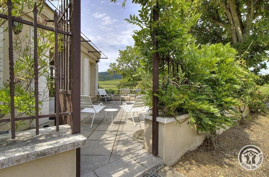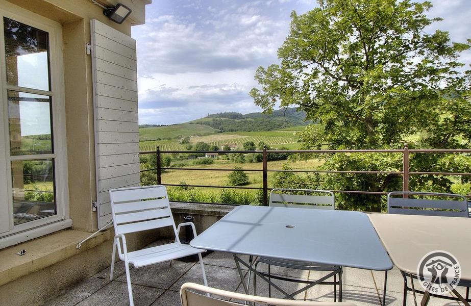Grand Gîte "Zaccharie" pour 15 personnes au Domaine "Château Thivin", Mont Brouilly, dans le Beaujolais - Rhône : la terrasse avec vue sur le vignoble.