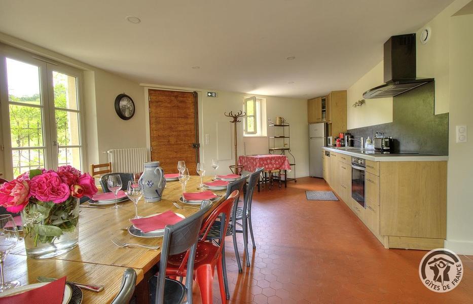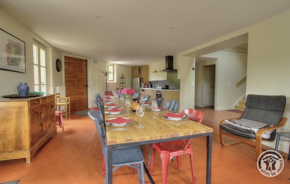 Grand Gîte "Zaccharie" pour 15 personnes au Domaine "Château Thivin", Mont Brouilly, dans le Beaujolais - Rhône : le coin repas et coin cuisine dans le séjour au rez-de-chaussée.