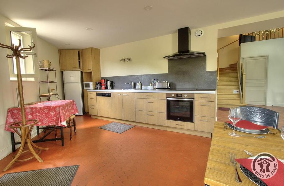 Grand Gîte "Zaccharie" pour 15 personnes au Domaine "Château Thivin", Mont Brouilly, dans le Beaujolais - Rhône : le coin cuisine dans le séjour au rez-de-chaussée.