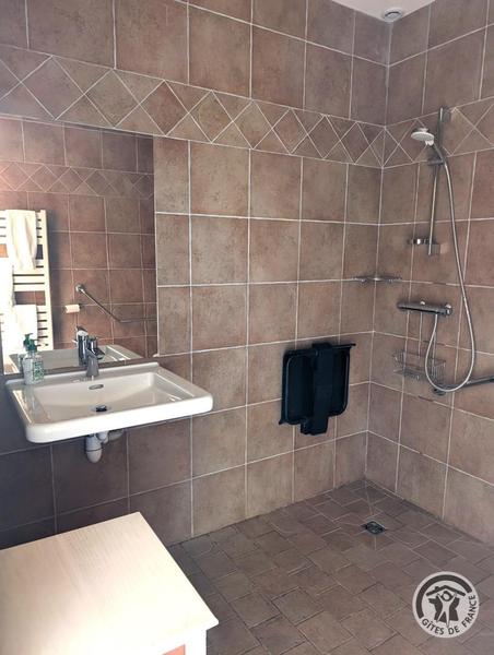 Grand Gîte "Zaccharie" pour 15 personnes au Domaine "Château Thivin", Mont Brouilly, dans le Beaujolais - Rhône : la salle d'eau dans la Chambre Gouais au rez-de-chaussée, accessible pour personnes handicapées.