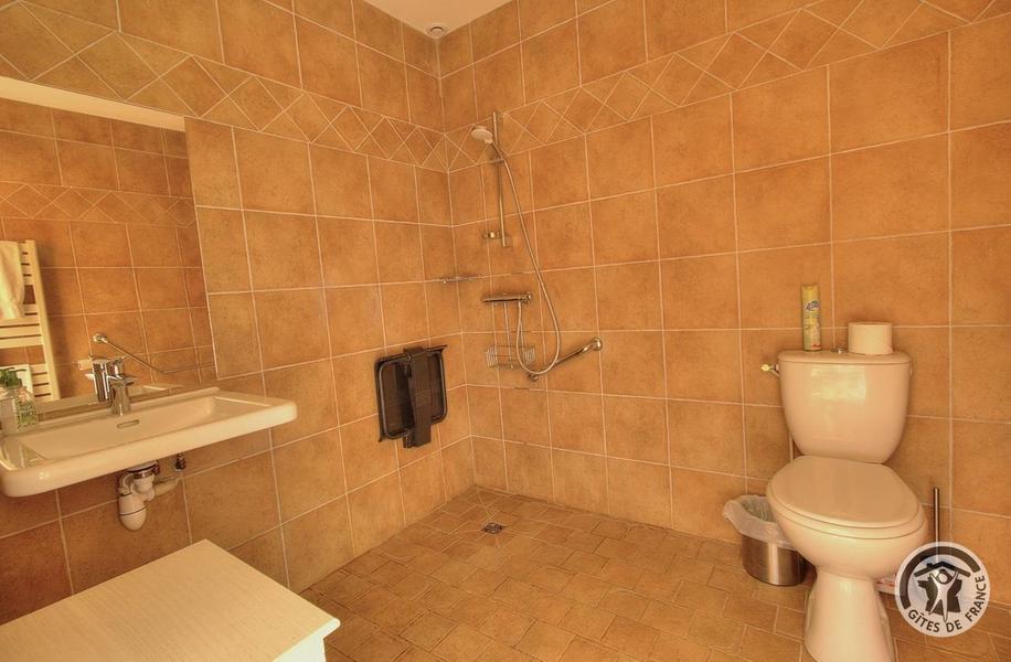 Grand Gîte "Zaccharie" pour 15 personnes au Domaine "Château Thivin", Mont Brouilly, dans le Beaujolais - Rhône : dans la Chambre Gouais au rez-de-chaussée, sanitaires privés accessibles pour personnes handicapées.