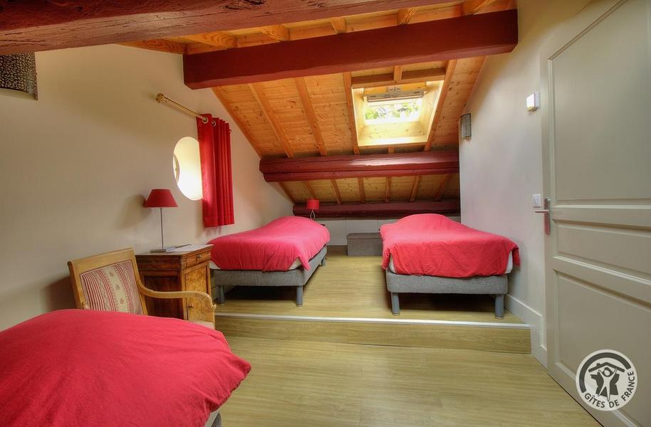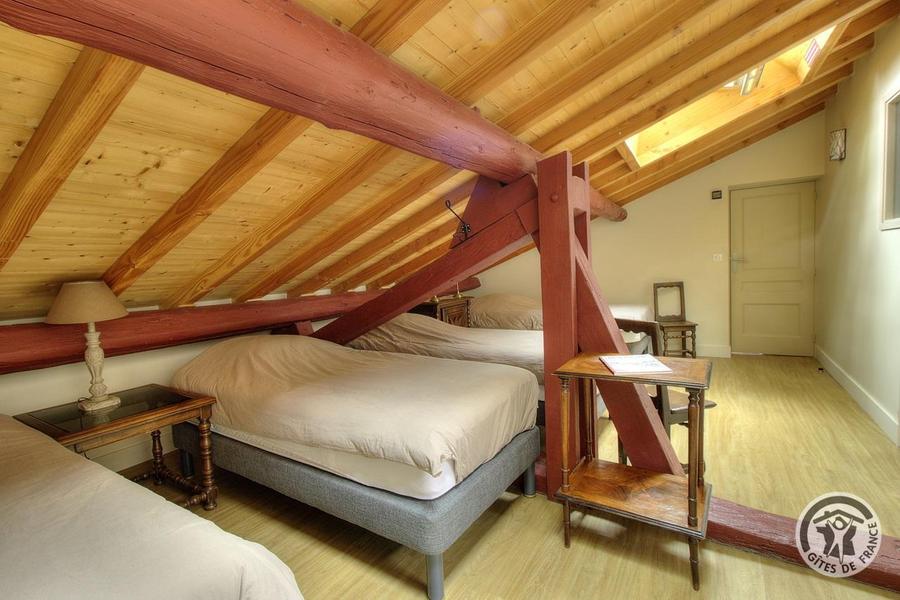 Grand Gîte "Zaccharie" pour 15 personnes au Domaine "Château Thivin", Mont Brouilly, dans le Beaujolais - Rhône : la Chambre Sirah - 3 personnes à l'étage.