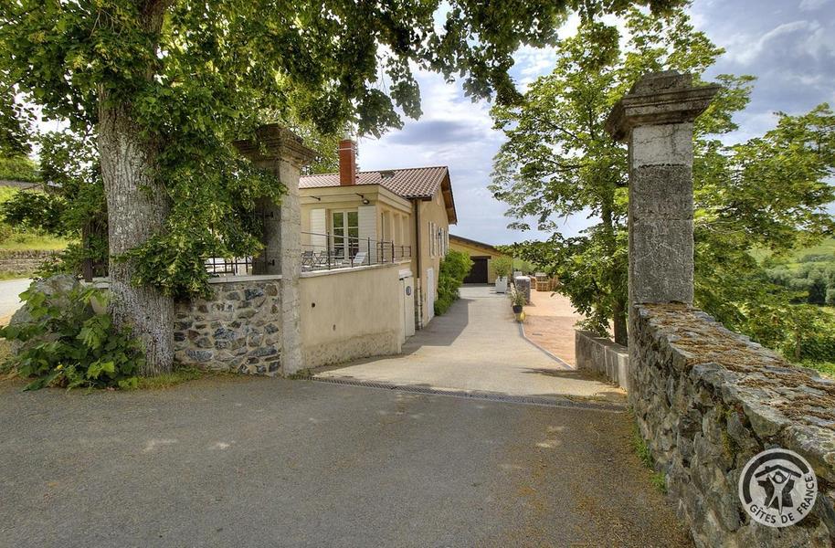 Grand Gîte "Zaccharie" pour 15 personnes au Domaine "Château Thivin", Mont Brouilly, dans le Beaujolais - Rhône : l'entrée du Domaine avec le Gîte sur la gauche.