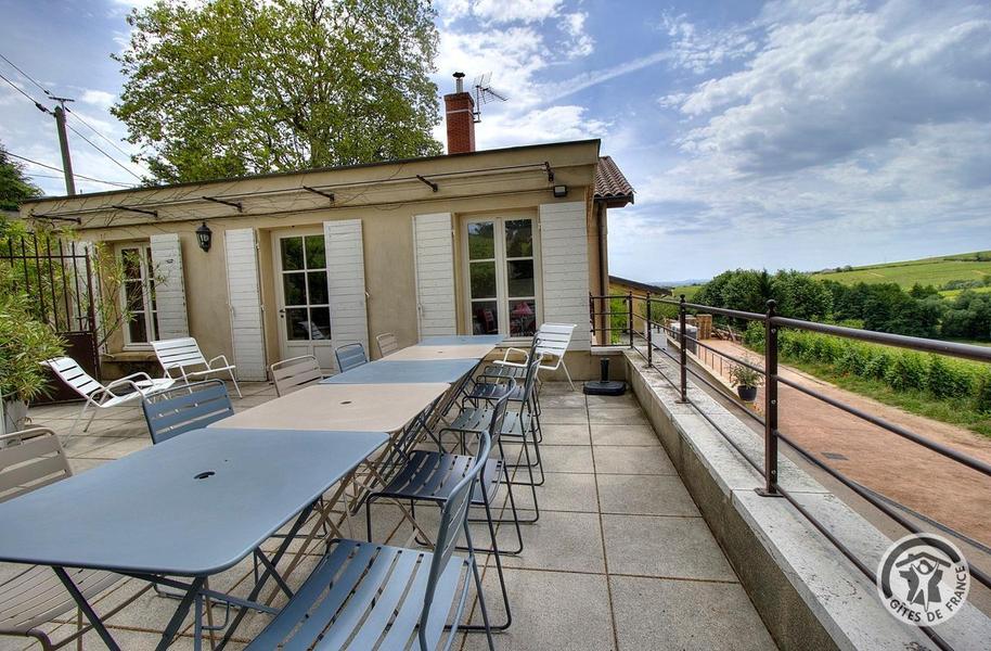 Grand Gîte "Zaccharie" pour 15 personnes au Domaine "Château Thivin", Mont Brouilly, dans le Beaujolais - Rhône : la terrasse avec vue en contrebas sur le Domaine et les vignes.