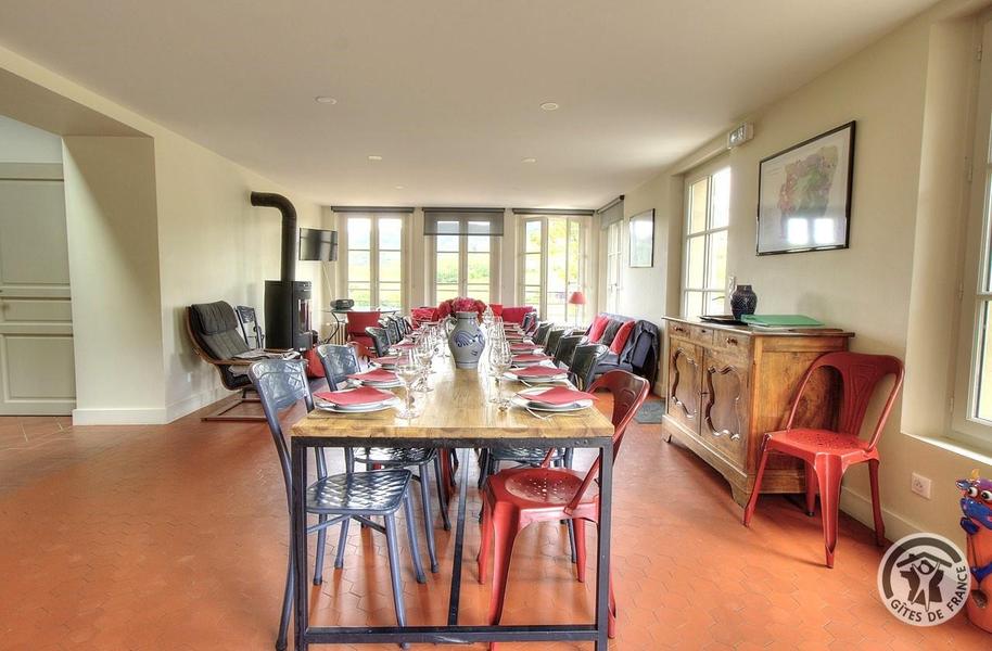 Grand Gîte "Zaccharie" pour 15 personnes au Domaine "Château Thivin", Mont Brouilly, dans le Beaujolais - Rhône : le coin repas dans le séjour au rez-de-chaussée.