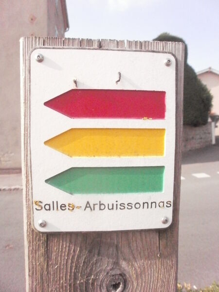 Itinéraire : Départ : pré du Breuil, au croisement de la rue du Breuil et de la rue du 11 novembre (parking 50 places) En quittant le parking par la grille qui fait l’angle, prendre à gauche et descendre la rue du Breuil en direction du grand carrefour, au hameau Le Briey. Traverser la D19 et prendre le chemin de l’Éperon en biais à gauche. Traverser le ruisseau Le Sallerin et remonter au hameau Le Tang. Traverser la route goudronnée et prendre la direction du hameau La Laveuse par un chemin au milieu des vignes. Tourner à gauche sur le chemin de La Laveuse, continuer sur 100 m la route du Pont Mathivet puis tourner à droite sur la D19-1 route du Plageret, jusqu’à l’église d’Arbuissonnas. Après l’église, prendre le chemin à droite qui descend sur la route des Combes, puis à droite jusqu’à la route des Granges. Prendre la première route à gauche, puis au calvaire, prendre à droite route de Zacharie, et prendre le chemin du Tacot à gauche, puis la route du Tacot. Point de vue sur le vallon et la plaine de la Saône. Tourner à gauche chemin des Vignes, puis à gauche route de Zacharie, et enfin quitter la route goudronnée après 100 m pour emprunter un chemin à droite en contrebas d’un bois et remonter à travers les vignes. Traverser la route des Combes, continuer sur la route des Sables, puis tourner à droite route du Plageret sur 150 m. Prendre à gauche le chemin dans les vignes sur environ 3 km ( !! ! point de vue sur le vallon et la plaine de la Saône) et rejoindre la D35 (route de Vaux) à gauche. Après le virage en lacet, prendre le chemin à droite qui monte. Cheminer 3 km entre vignes et sous-bois, en terminant par le chemin de la météorite jusqu’au hameau de la Folie. Tourner à gauche et rejoindre le village de Salles-Arbuissonnas par la route de la Folie, puis la route de la Péreuse. Emprunter la première rue à gauche : la rue de la Voute, en entrant dans le village. Passer devant l’école. Tourner ensuite à gauche en passant sous la voute de la rue de l’église (juste avant le restaurant). Suivre la ruelle jusqu’au Musée du Prieuré, admirer la porte gothique du cloître, à droite de l’église. Contourner l’église par la gauche et traverser les jardins du Chapitre. Prendre ensuite à droite la rue du 11 novembre pour rejoindre le parking.