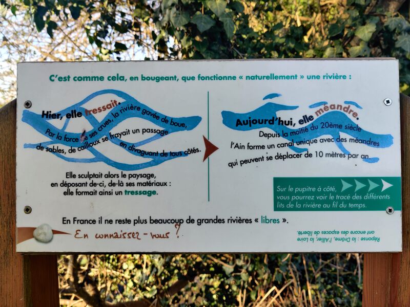 Une immersion dans les larges méandres ponctués par des bancs de galets et des lônes de la rivière d'Ain, qui change fréquemment de forme et dont le cours varie au gré des crues. Elle vit ici un parcours en liberté, c'est-à-dire un espace où elle peut divaguer, déborder, prendre ses aises. Cette dynamique crée une mosaïque de milieux : lônes, brotteaux, ripisylves qui abritent une faune et flore riches. La forêt alluviale y est naturelle et bordée par des pelouses sèches à orchidées. De nombreux panneaux d'interprétation jalonnent le parcours pour vous aider à découvrir les phénomènes naturels de la rivière, et vous guident dans l'appréciation du patrimoine autour du village de Blyes, comme le prieuré de Notre Dame des Ariges, construit avec les galets de la rivière d’Ain.