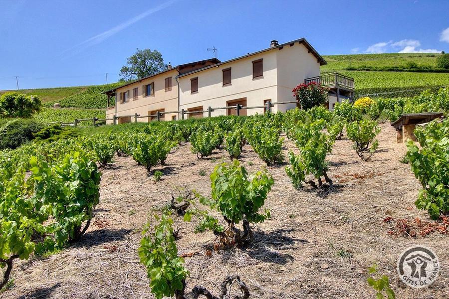 Grand Gîte - 12 personnes - "l'Artisan Vigneron" sur un Domaine viticole comportant 3 Gîtes à Fleurie dans le Beaujolais des Crus - vignoble - Rhône : la maison surplombant les vignes.
