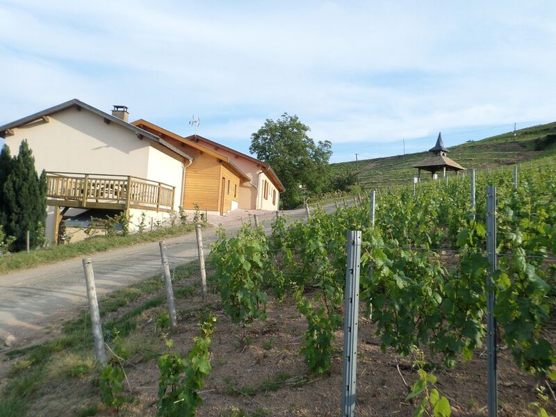 Grand Gîte - 12 personnes - "l'Artisan Vigneron" sur un Domaine viticole comportant 3 Gîtes à Fleurie dans le Beaujolais des Crus - vignoble - Rhône : le Gîte sur l'arrière avec un accès de plain-pied et terrasse.