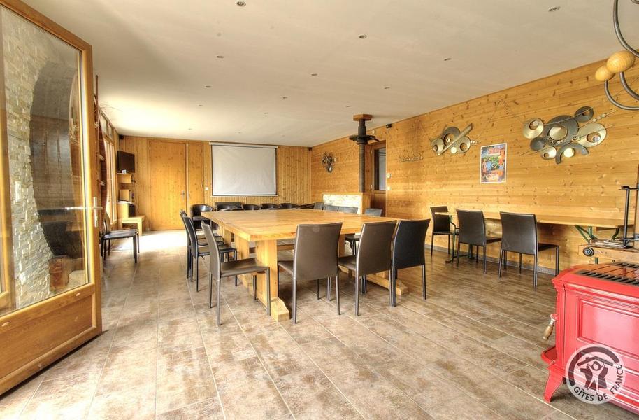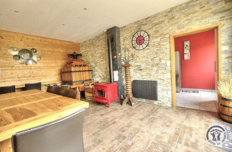 Grand Gîte - 12 personnes - "l'Artisan Vigneron" sur un Domaine viticole comportant 3 Gîtes à Fleurie dans le Beaujolais des Crus - vignoble - Rhône : le séjour avec accès à la cuisine et poêle à bois.