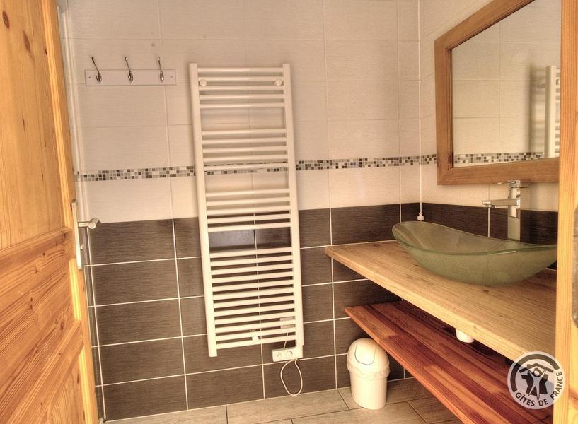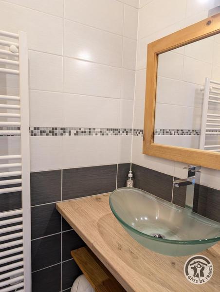 Grand Gîte - 12 personnes - "l'Artisan Vigneron" sur un Domaine viticole comportant 3 Gîtes à Fleurie dans le Beaujolais des Crus - vignoble - Rhône : le lavabo dans la salle d'eau.