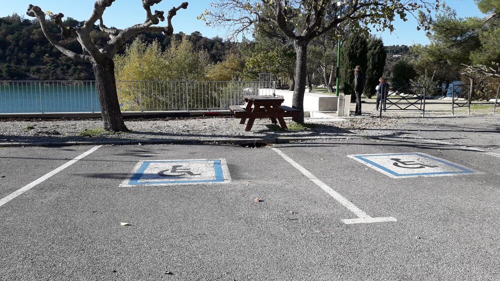 49 places dont 2 pour personnes à mobilité réduite et 2 emplacements pour recharge voitures électriques. Equipé de table de pique-nique avec vue sur lac, proche de -la plage (surveillée en été), -du ponton.