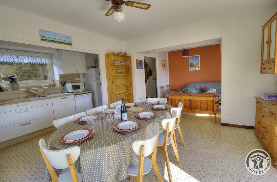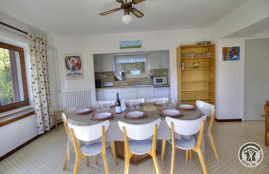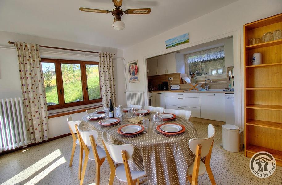 Gîte de Haute-Combe à Juliénas dans le Beaujolais (vignobles) - Rhône : le coin cuisine et coin repas au rez-de-chaussée.