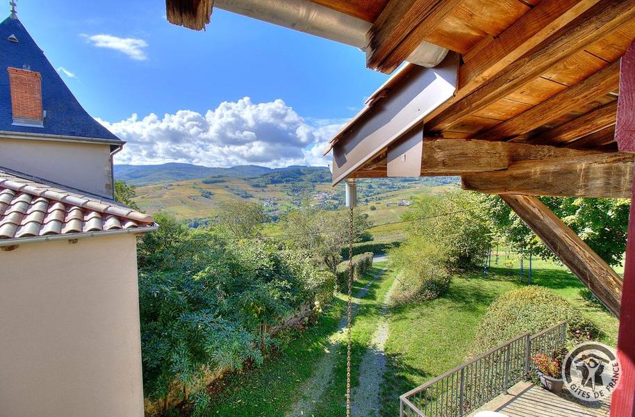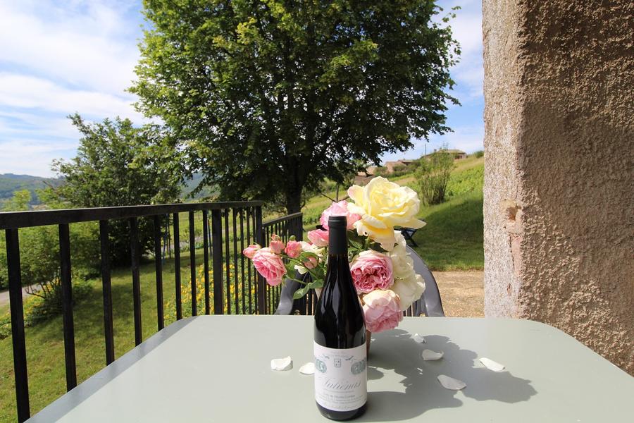 Gîte de Haute-Combe à Juliénas dans le Beaujolais (vignobles) - Rhône : la terrasse et vue sur le château.
