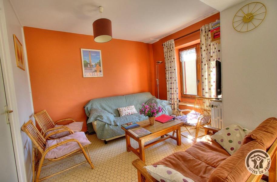 Gîte de Haute-Combe à Juliénas dans le Beaujolais (vignobles) - Rhône : le salon (TV) au rez-de-chaussée.