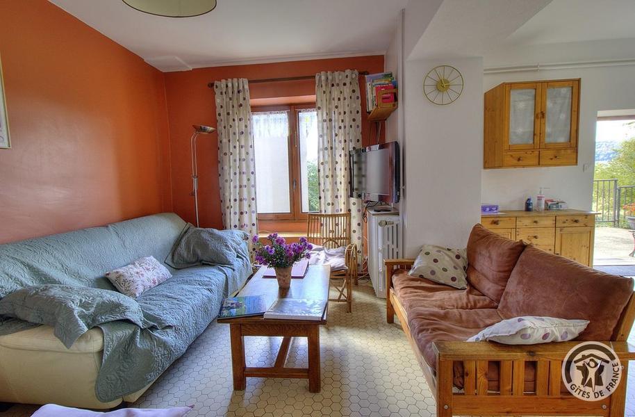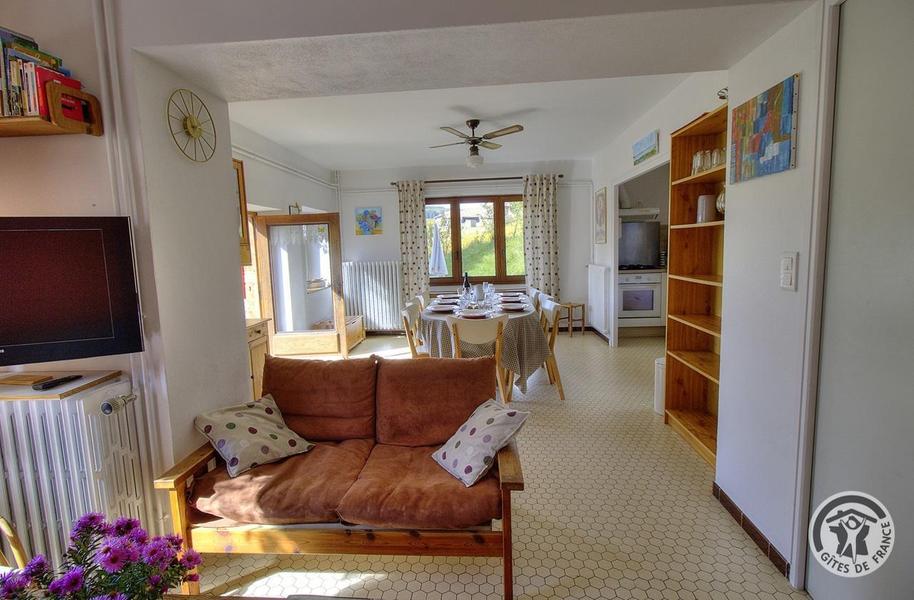 Gîte de Haute-Combe à Juliénas dans le Beaujolais (vignobles) - Rhône : le salon ouvert sur le séjour au rez-de-chaussée.