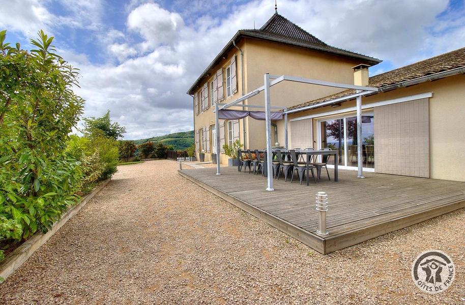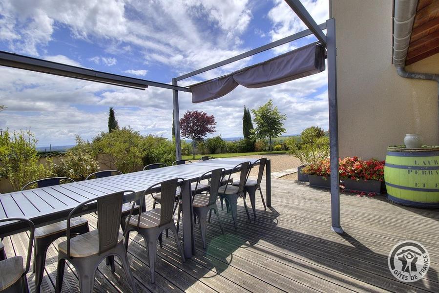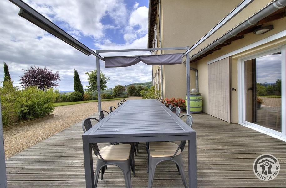 Grand Gîte "Le Prieuré des Mouilles" avec piscine privée à Juliénas, dans le Beaujolais des crus - proximité Bourgogne et Mâcon, dans le Rhône : la terrasse.