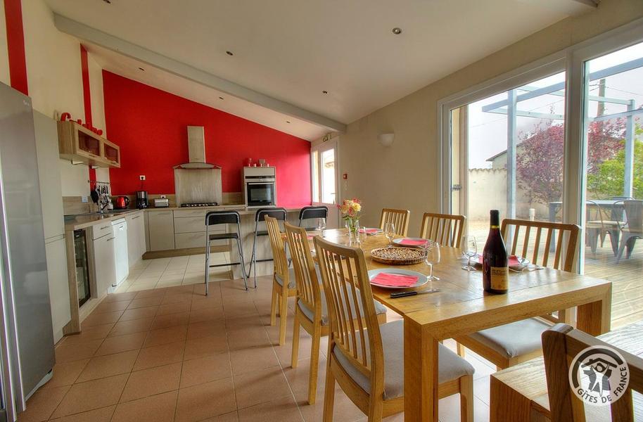 Grand Gîte "Le Prieuré des Mouilles" avec piscine privée à Juliénas, dans le Beaujolais des crus - proximité Bourgogne et Mâcon, dans le Rhône : Cuisine/séjour.