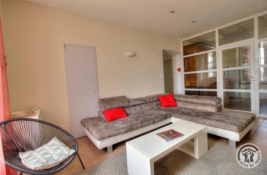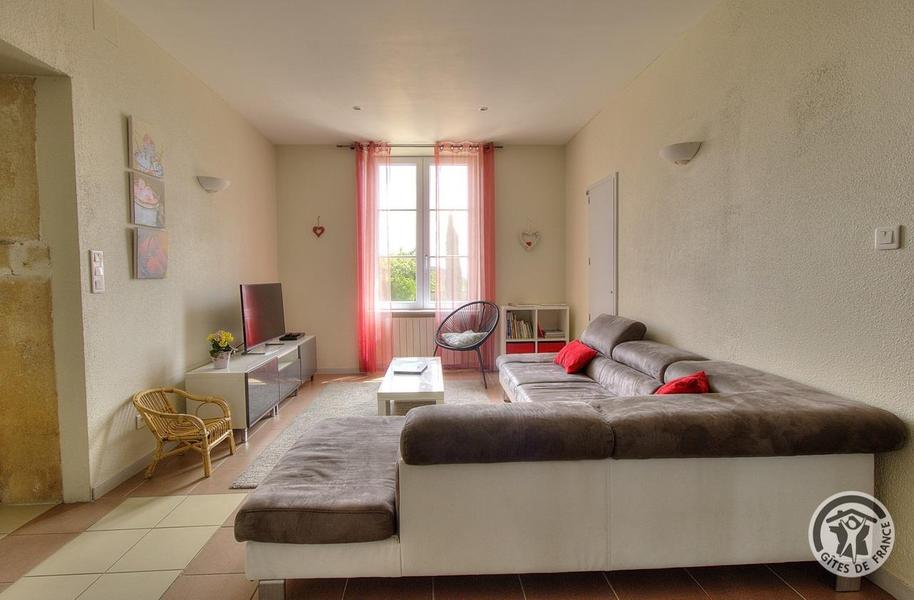 Grand Gîte "Le Prieuré des Mouilles" avec piscine privée à Juliénas, dans le Beaujolais des crus - proximité Bourgogne et Mâcon, dans le Rhône : le salon ouvre sur le séjour.