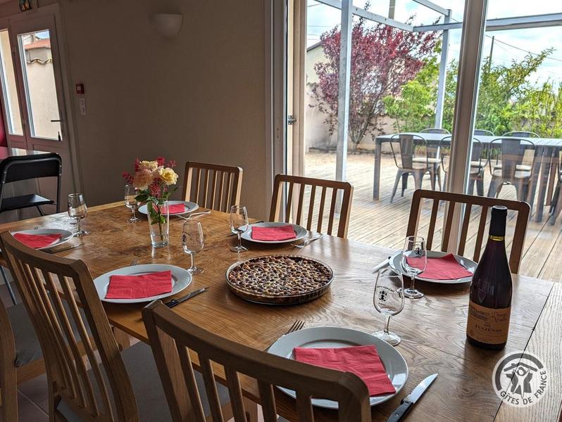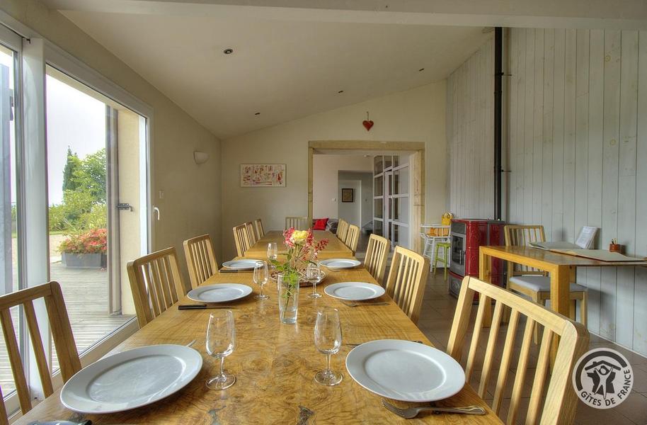 Grand Gîte "Le Prieuré des Mouilles" avec piscine privée à Juliénas, dans le Beaujolais des crus - proximité Bourgogne et Mâcon, dans le Rhône : Espace repas dans le séjour au rez-de-chaussée.
