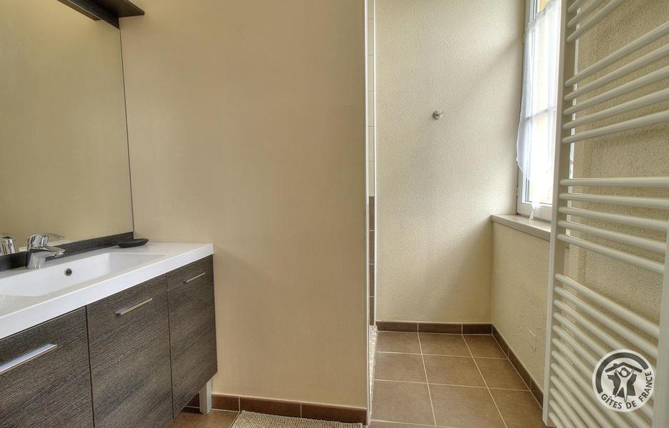 Grand Gîte "Le Prieuré des Mouilles" avec piscine privée à Juliénas, dans le Beaujolais des crus - proximité Bourgogne et Mâcon, dans le Rhône : la salle d'eau à l'étage.