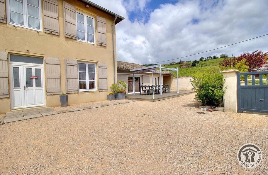 Grand Gîte "Le Prieuré des Mouilles" avec piscine privée à Juliénas, dans le Beaujolais des crus - proximité Bourgogne et Mâcon, dans le Rhône : l'entrée de la maison, cour et terrasse.