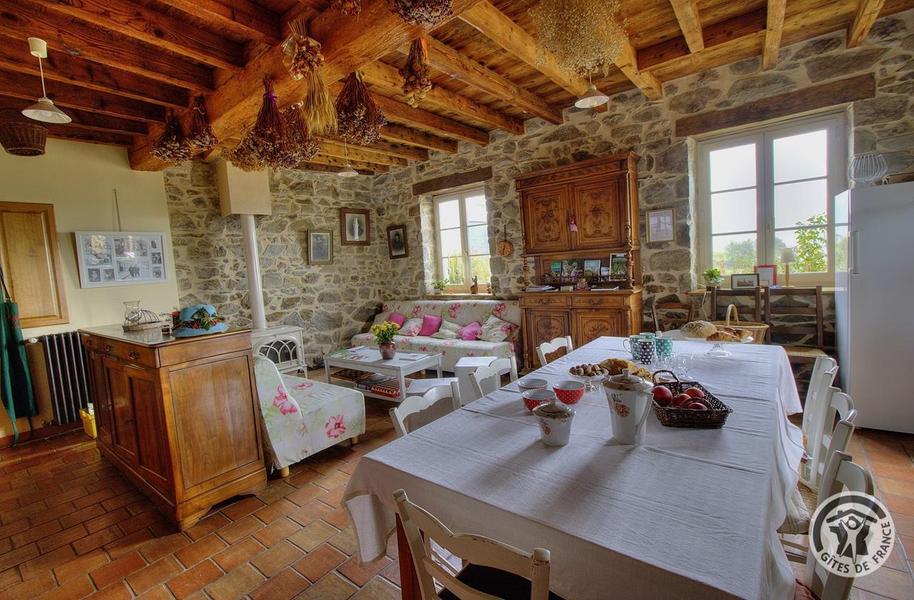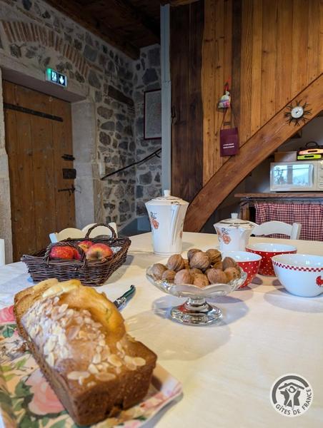 Chambres d'Hôtes "Domaine Lagneau" à Quincié en Beaujolais, proximité Beaujeu, vignobles dans le Rhône : coin repas et coin cuisine au rez-de-chaussée.