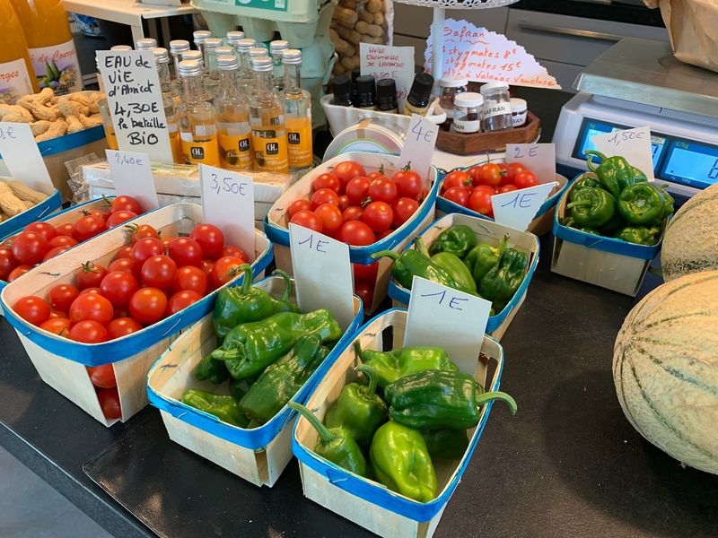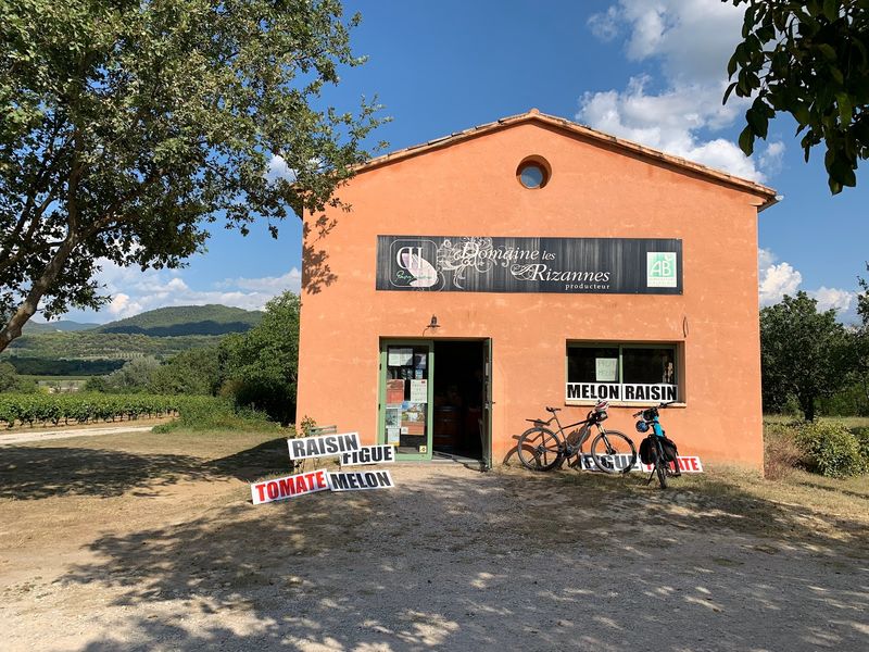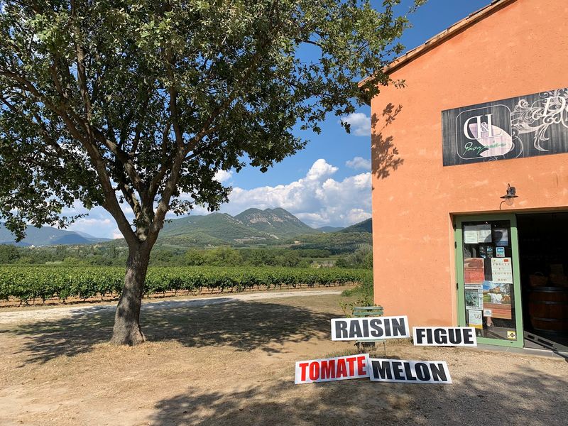 Vente de fruits et légumes, huile d'olive AOP, olives AOP, tapenade, confit d'olives, purée d'olives, pulpe d'olive à la tomate, jus de fruits et nectars (abricot, cerise blanche, raisin chasselas, raisin muscat, raisin cardinal, prune, ), confitures (abricot, figue, prune, raisin, pêche, melon, tomate verte, gigérine), vins AOP Côtes du Rhône, miel, etc...