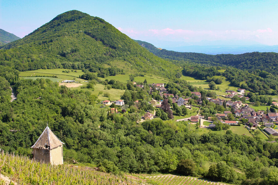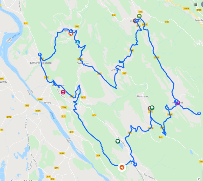 120 km depuis Lyon pour une boucle de 60km, 3h environ. La route de Bénonces au départ de Serrières-de-Briord est un défilé pentu, assez vertigineux qui met tout de suite dans l'ambiance. Les verdoyantes gorges du Tréfond, forment un vallon impressionnant. Il est possible de profiter, au hameau d'Onglas, de la balade pédestre de la cascade de Luizet (1h30 aller-retour). Eau selon saison (peu en été). Direction le village de Seillonnaz et ses nombreux viticulteurs (visite des caves et dégustation possibles - NB : boire ou conduire, il faut choisir, réservons la dégustation aux passagers). Au passage à Lompnas (prononcer Lôna), "chez Robert" peut être l'occasion d'une pause déjeuner sous le signe de la cuisine du terroir, ou à emporter. Sinon, tous les premiers dimanches du mois, c'est tartes et pizza dans le four à bois ! La route pour Ordonnaz fait la part belle aux virages en épingles et tracés sinueux entre sous-bois et paysages dégagés. La très jolie et ancienne église d'Ordonnaz vaut le coup d’œil pour ses vitraux contemporains colorés. Sur la place, un arbre Sully, multicentenaire, rappelle le rattachement du Bugey à la France. Il est nécessaire de faire une halte à la fruitière d'Ordonnaz, attenante au musée du Comté. Coralie la gérante, saura vous régaler avec une dégustation de ses excellents formages, et les histoires de la fabrication du Comté. La très longue descente vers Innimond est un vrai plaisir entre champs et forêt. L'arrivée sur Innimond est spectaculaire, en toute saison, avec son église perchée sur un promontoire, la chaîne alpine se détachant en arrière-plan. Comme à Ordonnaz, un petit tour à l'église et son Sully s'impose, puis direction le belvédère du Perthuis (panneaux verts depuis le village). Clou de la journée, ce spectaculaire point de vue offre une vue panoramique sur le Bugey et les Alpes. En hiver, le Mont-Blanc pointe sa tête enneigée sur la ligne des monts. Splendide ! Sur la redescente, il est possible de faire un crochet par Marchamp et son musée plein de beaux fossiles, ou de faire une balade à travers l'ancienne carrière de Cerin, sentier thématique et espace naturel protégé. Ceux qui préfèrent l'appel du ventre, feront un saut à la boutique du producteur "Au Millieu des Fruits", afin de goûter confitures, miel et fruits transformés. A quelques mètre, un beau belvédère offre une sympathique vue sur le lac de Millieu, étang lui aussi protégé. Entre Lhuis, joli bourg et son église classée valant le détout, et Montagnieu, les routes traversent vignes et coteaux. Superbe en automne ! Montagnieu, village vigneron fleuri, produit le vin blanc pétillant "Montagnieu". A déguster chez les viticulteurs locaux (Cave Peillot reçoit tous les après-midi, sauf dimanche). Pour finir la journée, pourquoi pas une baignade rafraîchissante à la base de loisirs du Point Vert, à Serrières-de-Briord ? Ou même réserver un pédalo au Nauticlub pour profiter de la fin de journée au calme