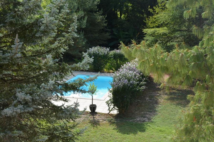 Grand Gîte 'La Fontaine Camille' à Neuville-sur-Saône (Rhône, Métropole de Lyon, Nord de Lyon) : vue sur la piscine depuis l'une des chambres.