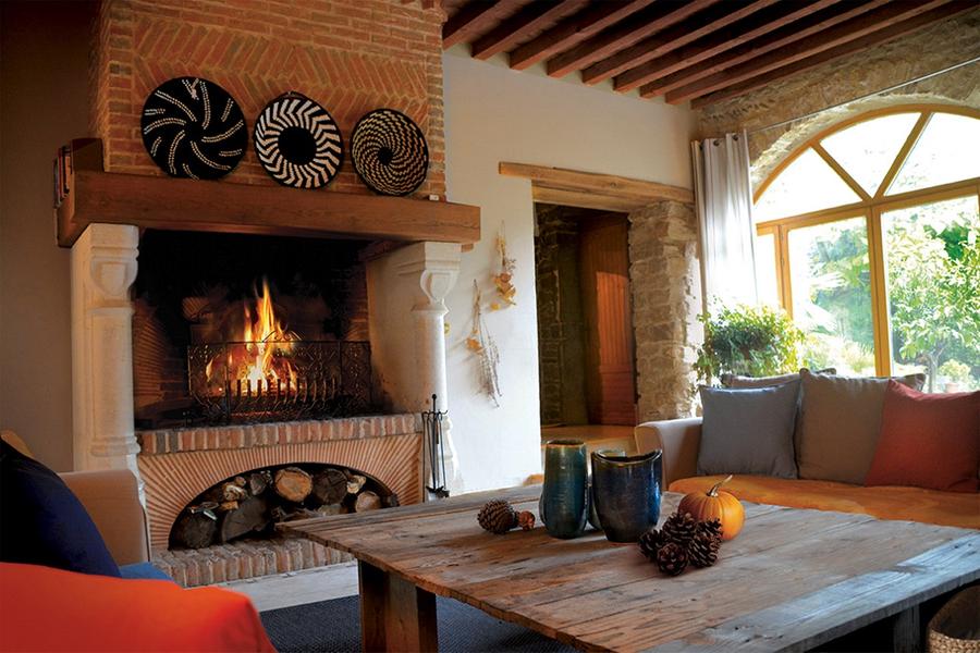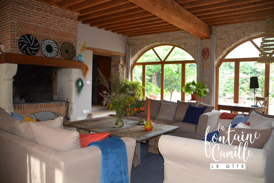 Grand Gîte 'La Fontaine Camille' à Neuville-sur-Saône (Rhône, Métropole de Lyon, Nord de Lyon) : le salon avec cheminée.