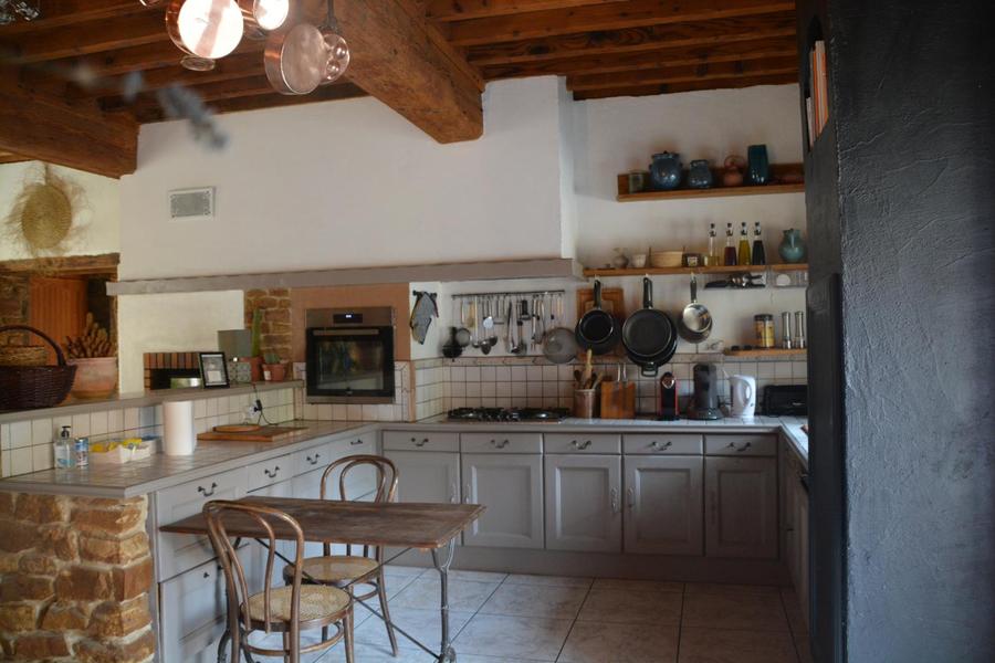 Grand Gîte 'La Fontaine Camille' à Neuville-sur-Saône (Rhône, Métropole de Lyon, Nord de Lyon) : pièce de jour, espace cuisine.