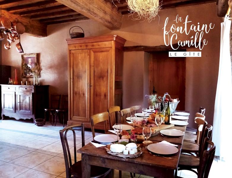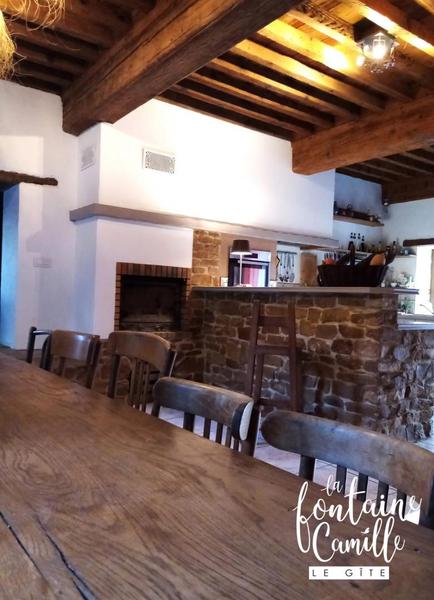 Grand Gîte 'La Fontaine Camille' à Neuville-sur-Saône (Rhône, Métropole de Lyon, Nord de Lyon) : espace repas dans le séjour.