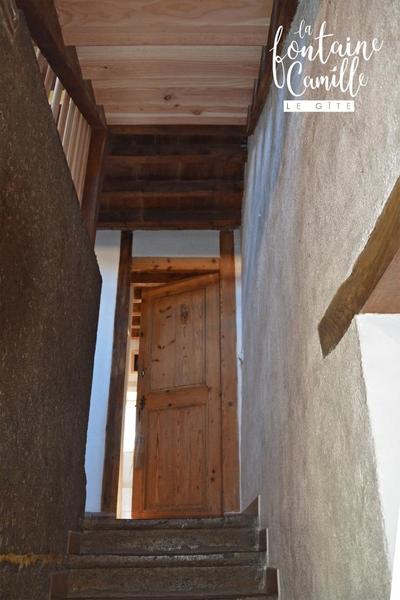 Grand Gîte 'La Fontaine Camille' à Neuville-sur-Saône (Rhône, Métropole de Lyon, Nord de Lyon) : l'accès à l'étage, porte ouverte sur la salle d'eau avec toilettes au 1/2 étage.