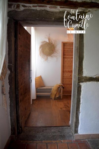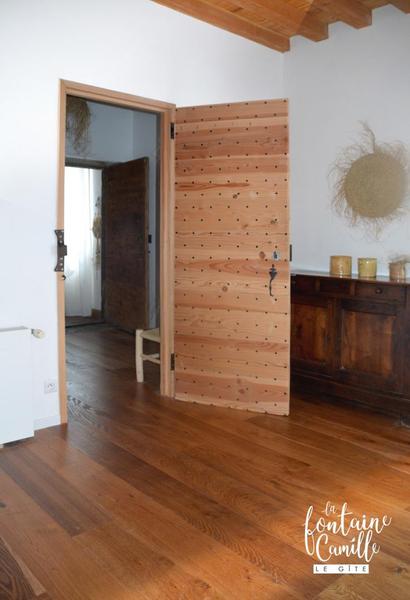 Grand Gîte 'La Fontaine Camille' à Neuville-sur-Saône (Rhône, Métropole de Lyon, Nord de Lyon) : Chambre au 1er étage, porte en bois.