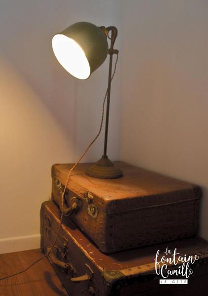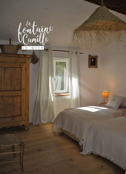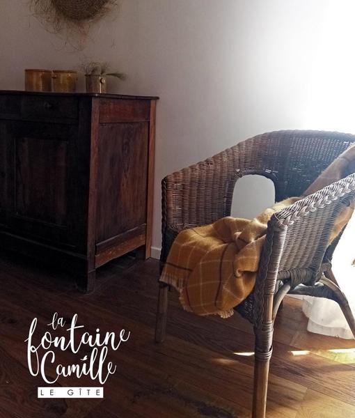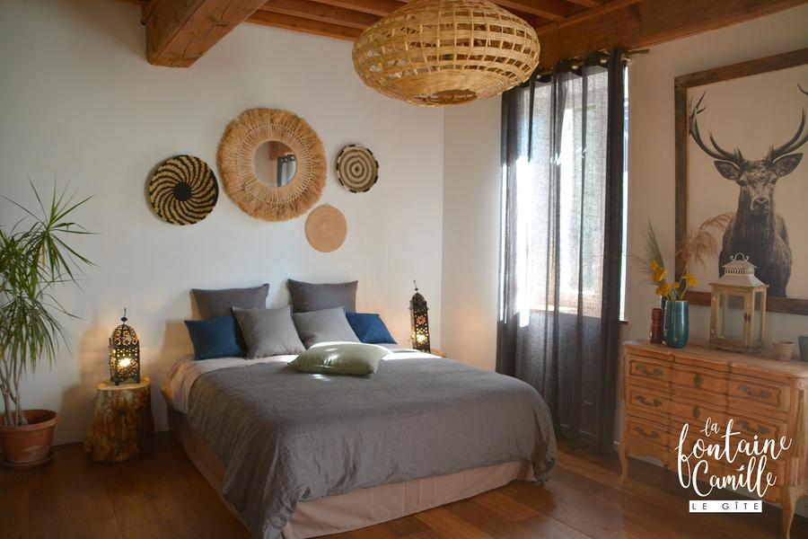Grand Gîte 'La Fontaine Camille' à Neuville-sur-Saône (Rhône, Métropole de Lyon, Nord de Lyon) : mobilier dans une chambre, ambiance 'campagne chic'.