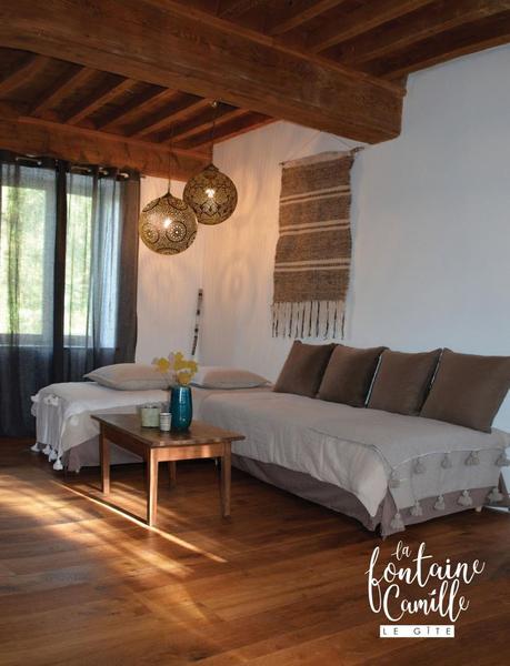 Grand Gîte 'La Fontaine Camille' à Neuville-sur-Saône (Rhône, Métropole de Lyon, Nord de Lyon) : les 2 lits 1 personne de la Chambre familiale aménagés en espace salon.