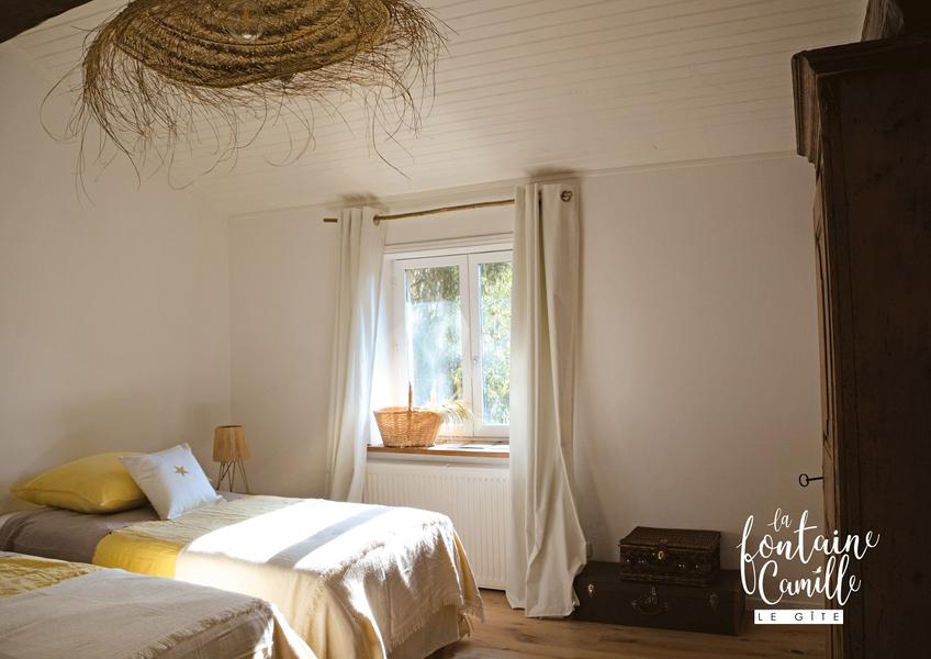 Grand Gîte 'La Fontaine Camille' à Neuville-sur-Saône (Rhône, Métropole de Lyon, Nord de Lyon) : la 2ème chambre avec 2 lits 1 personne, au 2ème étage.