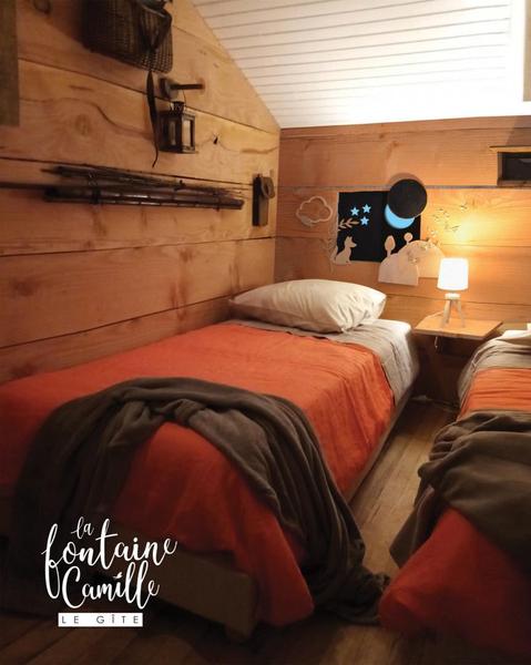 Grand Gîte 'La Fontaine Camille' à Neuville-sur-Saône (Rhône, Métropole de Lyon, Nord de Lyon) : l'espace nuit 'Cabane'composé de 2 lits 1 personne, au 2ème étage.