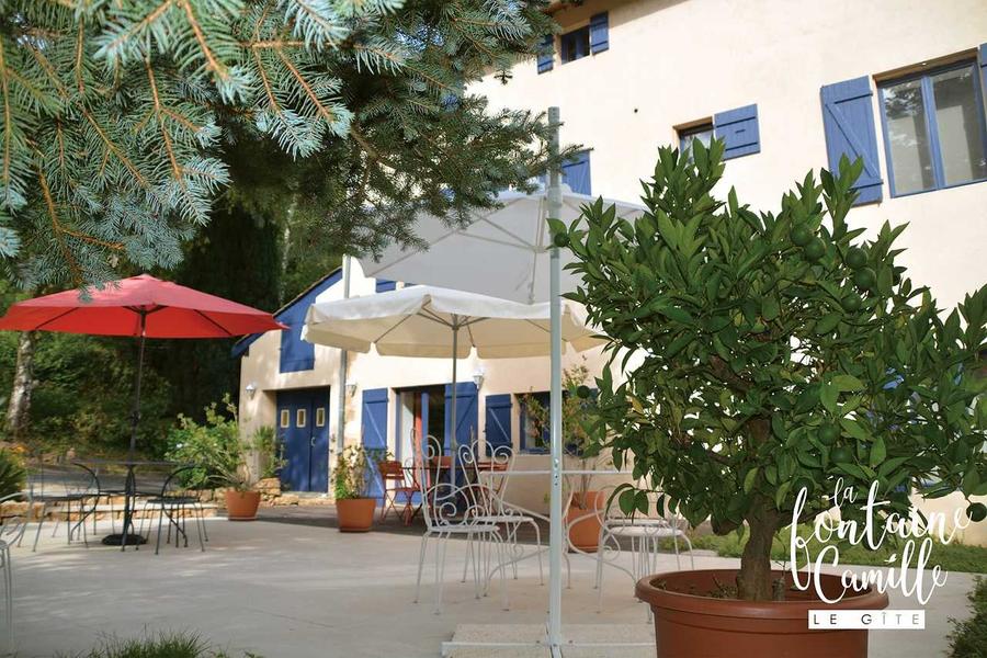 Grand Gîte 'La Fontaine Camille' à Neuville-sur-Saône (Rhône, Métropole de Lyon, Nord de Lyon) : terrasse côté cour (Est).