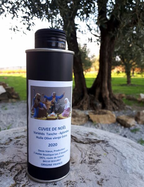 "Ma passion de l’olivier m’a conduit à suivre une formation en oléiculture au lycée des Alpilles à St-Rémi de Provence à l’issue de laquelle j’ai obtenu le diplôme d’oléiculteur (élaboration de l’huile d’olive, dégustation, taille entretien des vergers et commercialisation). Possédant déjà quelques oliviers, j’ai fait en 2016 de nouvelles plantations et j’exploite également en fermage des oliviers centenaires sur mon village. Cela me permet donc de produire ma propre huile d’olive VIERGE EXTRA qui est élaborée au moulin de Segur à Séguret. Je vous propose 3 cuvées spéciales : - La Cuvée de Noël, huile primeur à base de Tanche et d'Aglandau. - La Cuvée Saint-Joseph, plus douce avec des arômes d'amandes fraîches et en fin de bouche des notes d'avocats. - La Cuvée Saint-Louis, un mélange savoureux d'amande fraîche et d'herbe coupée. Disponible en 2 litres, 3 litres et 5 litres." L'olivier n'aura plus de secrets pour vous grâce à une dégustation commentée d'huile d'olive de régions oléïcoles françaises enrichies des histoires sur cet arbre emblématique de la méditerranée et sur la fabrication de ce nectar ensoleillé. Sur réservation.