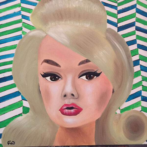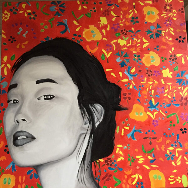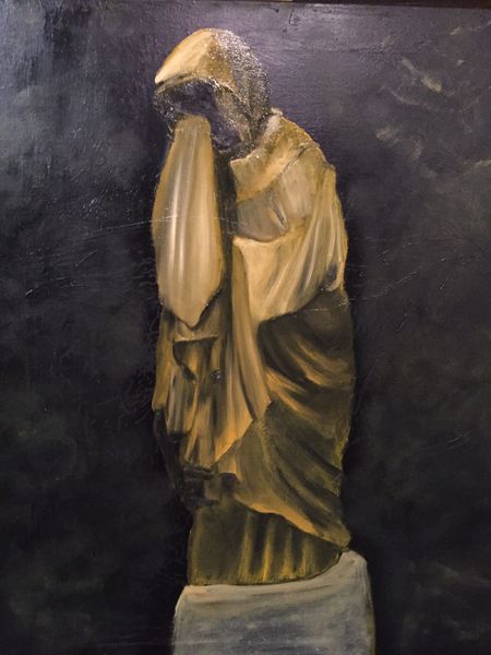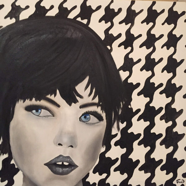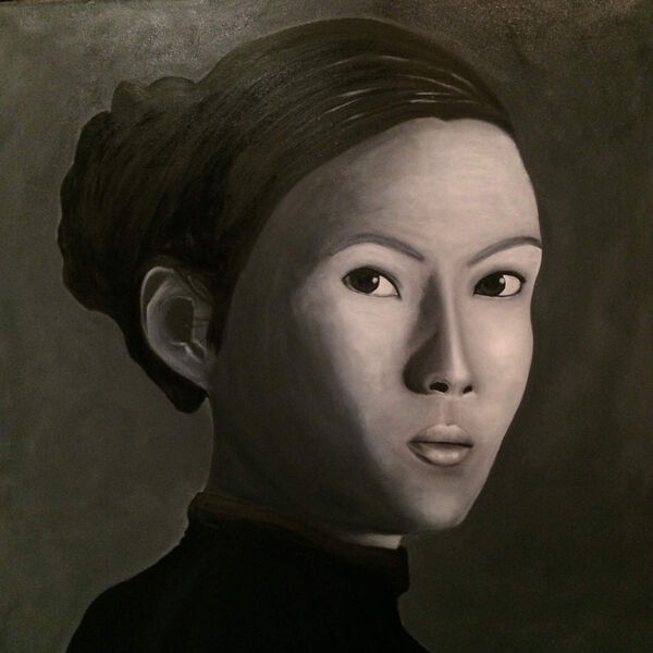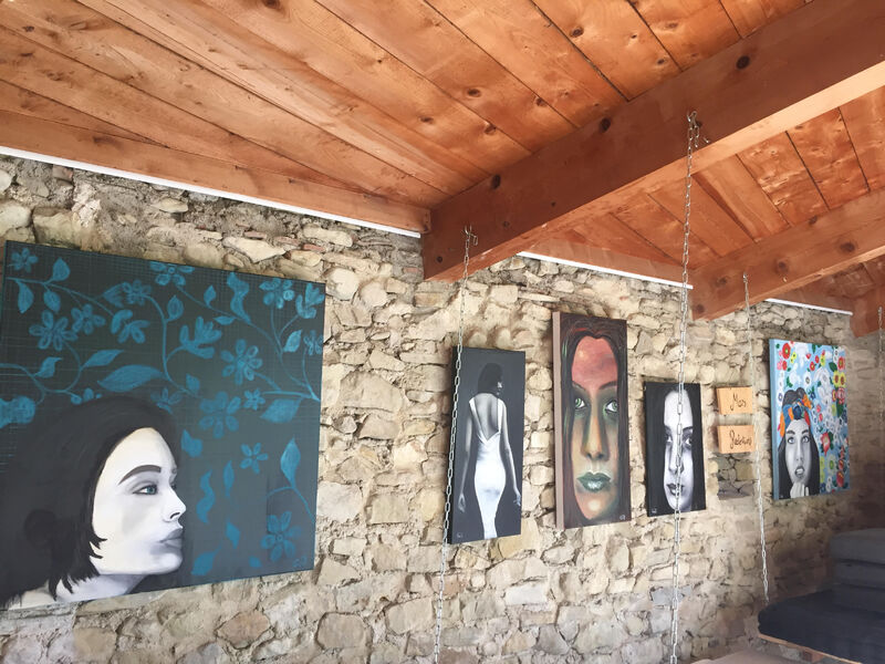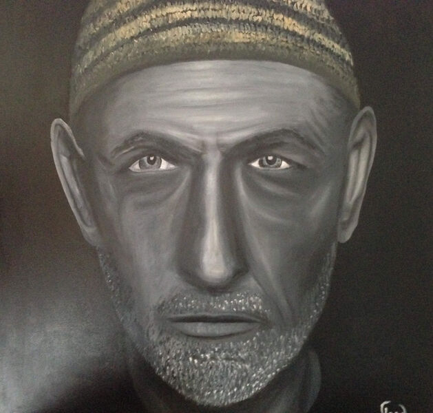 Exposition des tableaux de Frédéric: peinture à l'huile, portraits noir et blanc, fonds colorés.